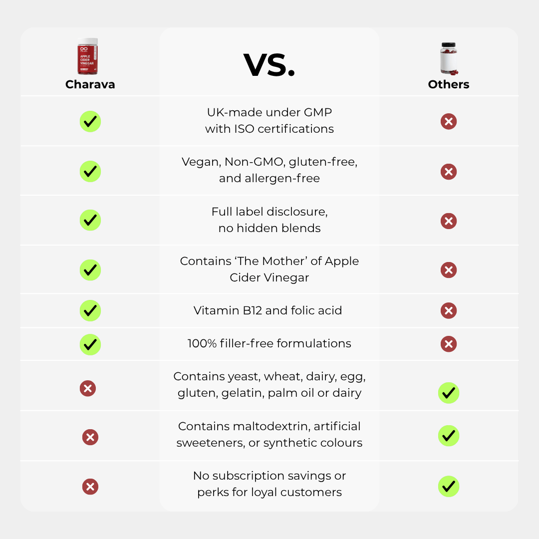 While traditional liquid vinegar is effective, its strong taste and acidity can be harsh on teeth and digestion. That’s why Charava’s Apple Cider Vinegar comes in a delicious, easy-to-take gummy form — delivering the same benefits without the burn.