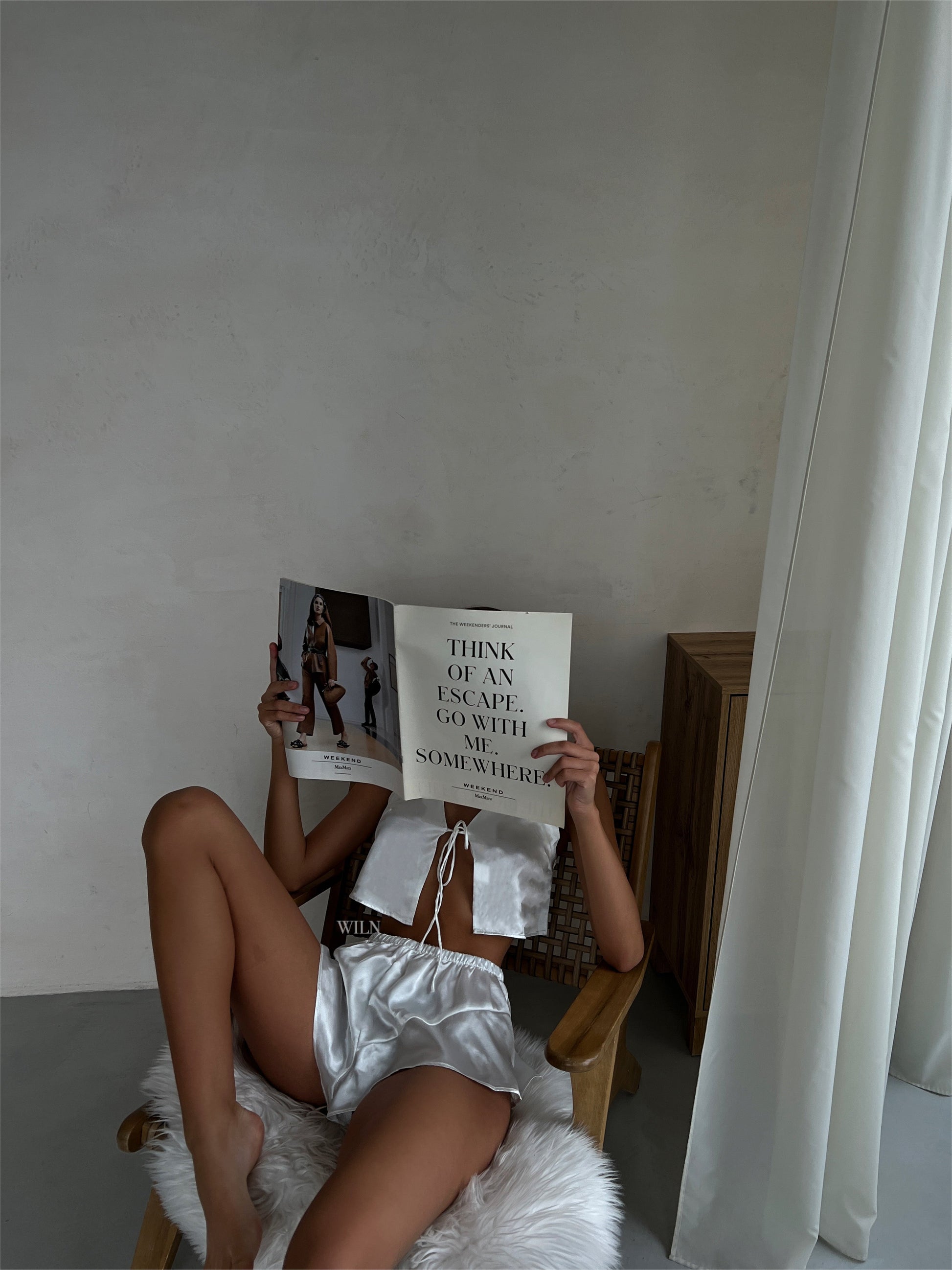 Discover our new CRUSH 2 Piece Romantic Lounge Set.This sexy and playful set is designed from a silky satin fabric and combines a vest with a deep plunging neckline, together with matching shorts with a lightly elasticated waistband for a great fit.