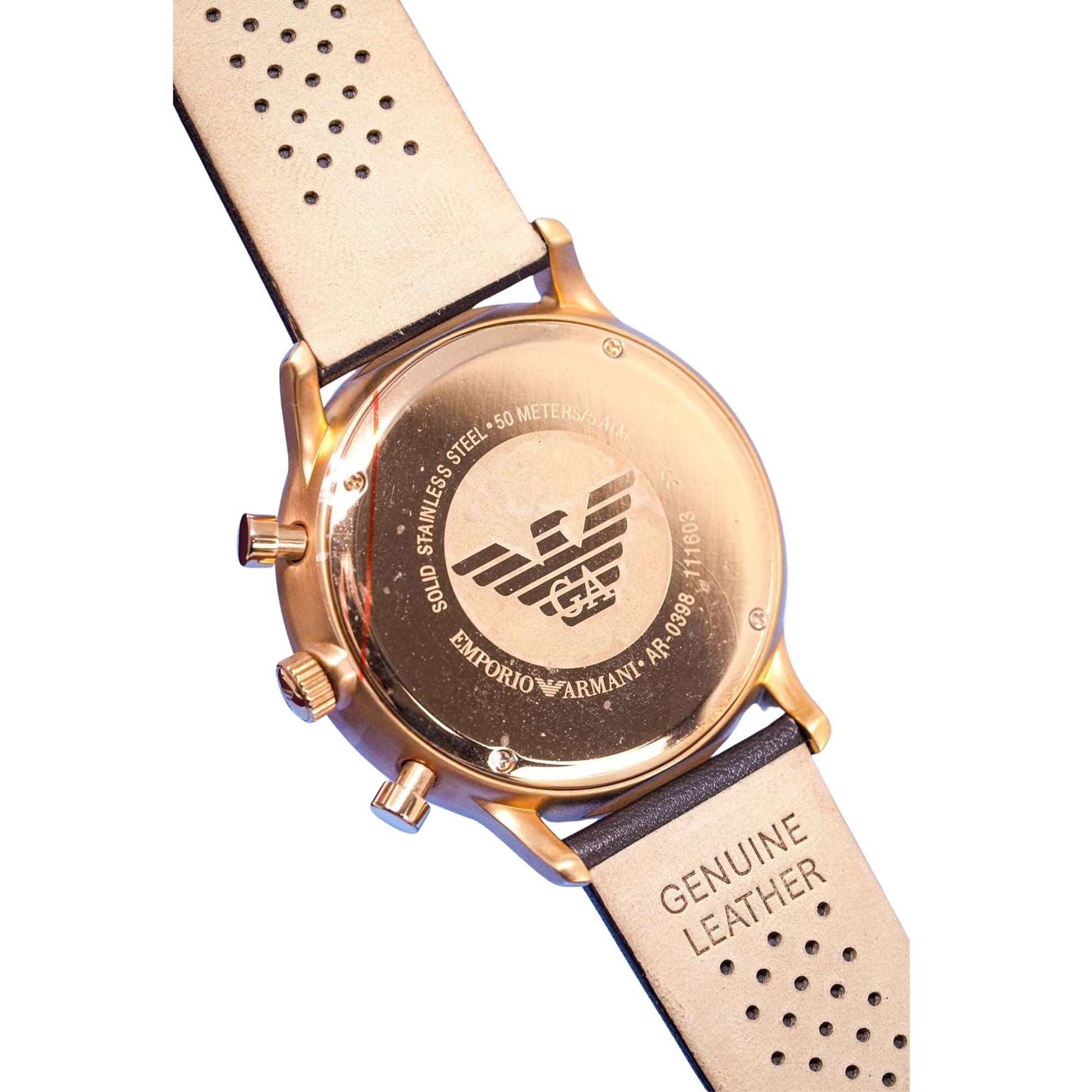 Emporio Armani AR0398 Men's Rose Gold Chronograph Watch with White Dial and Brown Leather Strap