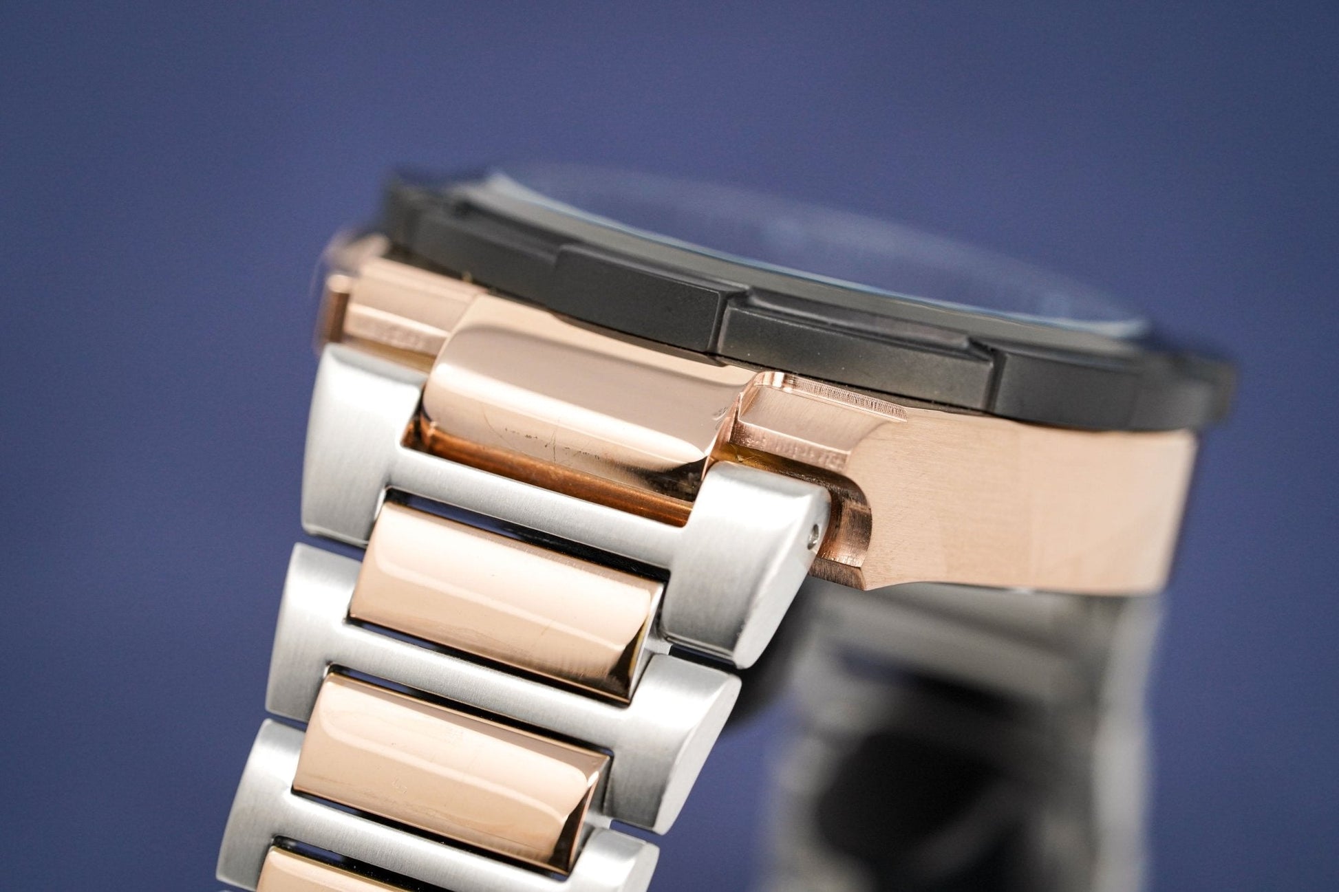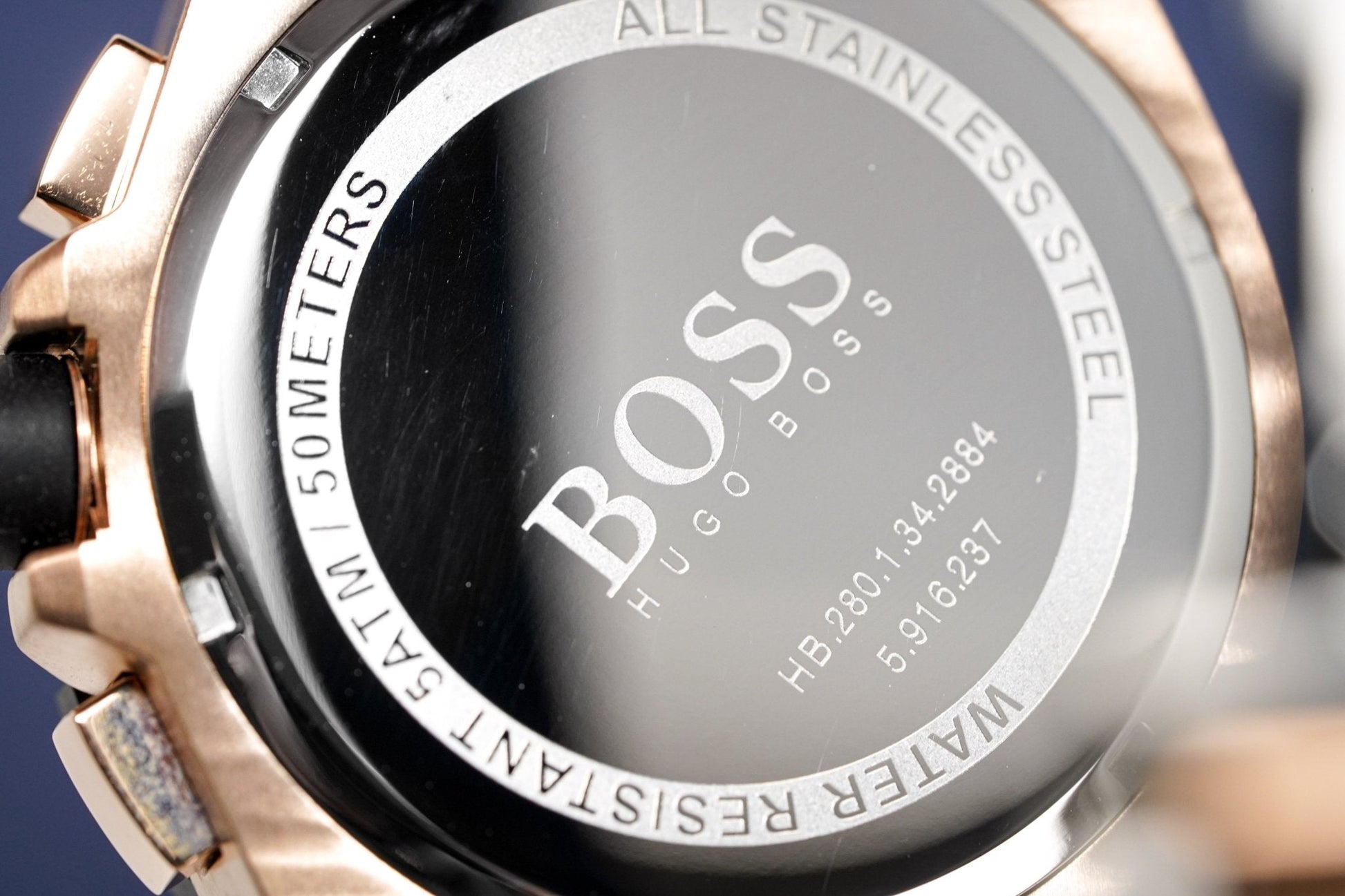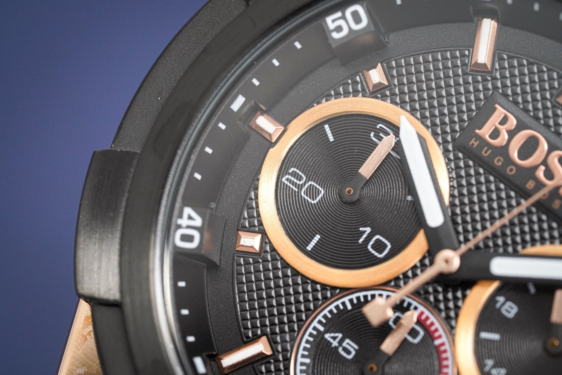 45mm Rose Gold PVD Plated Stainless Steel Case. Scratch Resistant Mineral Crystal.