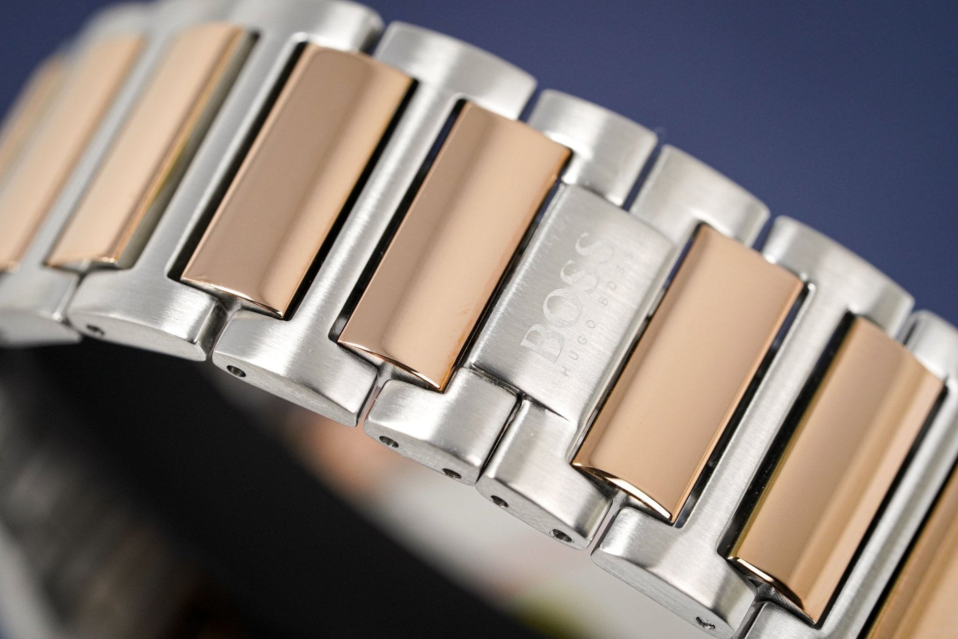 Rose Gold PVD Plated/Stainless Steel Bracelet with Stainless Steel Push Button Butterfly Clasp.