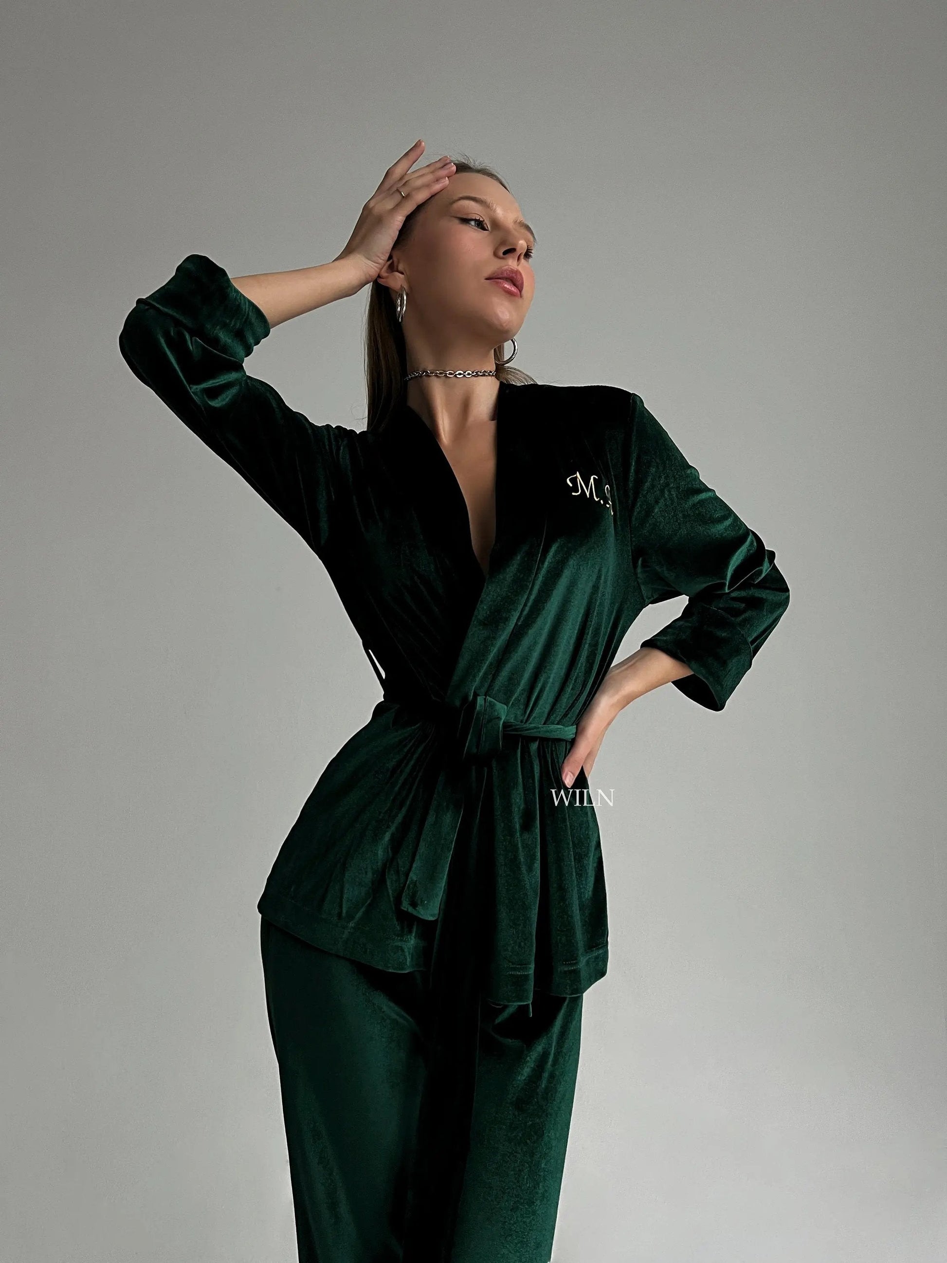 Channel your inner royal in this sumptuous bridal Robe in black or emerald. The elegant flowy long sleeves of the kimono will make you feel like a goddess! It doesn't get much more luxurious - or bridal - than that. Celebrate your wedding day or any other day with this getting-ready dressing gown that'll always remind you of your special day.